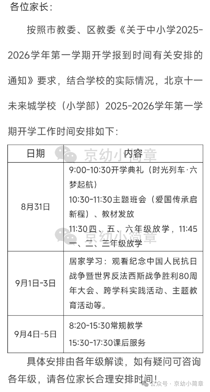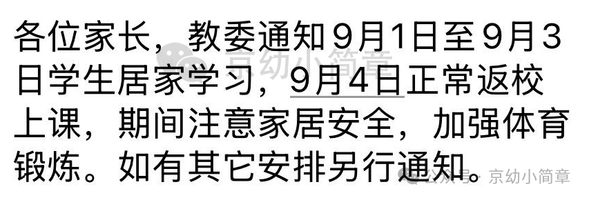 由于9月3日大型活动,目前海淀、东城、西城、朝阳、丰台、通州、昌平、平谷、门头沟、石景山、顺义和大兴明确通知了,其他区也会统一通知。还没收到通知的,请耐心等待,以学校通知为准。